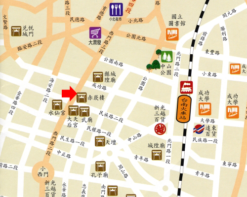 交通:台南火車站出發,走中山路至民生綠園轉至中正路直行至海安路口右轉,左手邊 任何一個入口皆可達。 |